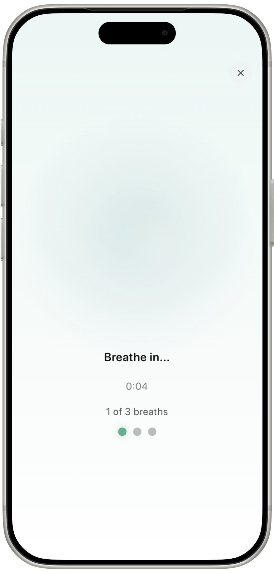An animated 11-petal circle expands on the inhale and contracts on the exhale. Your eyes do the work. Haptics sync the rhythm if your phone is face-down.